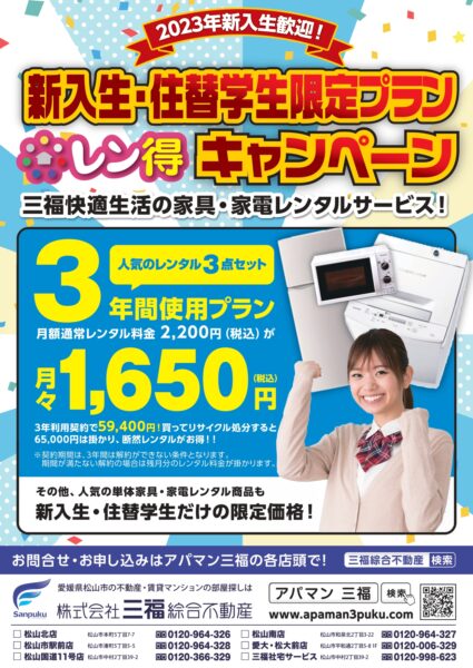 松山市の専門学校・新入生限定!家具家電レンタル「レン得」キャンペーン中!