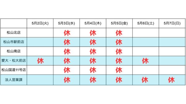 まことに勝手ながら、2023年のゴールデンウィークは5月2日(火)~5月7日(日)の間で各店舗の休業日を設けております。