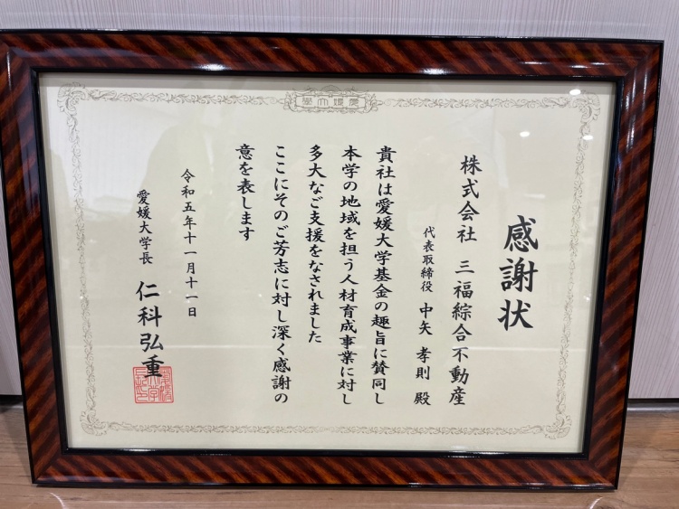2023年11月、三福綜合不動産は愛媛大学基金・感謝状贈呈式にお招きいただき、感謝状を頂戴しました。