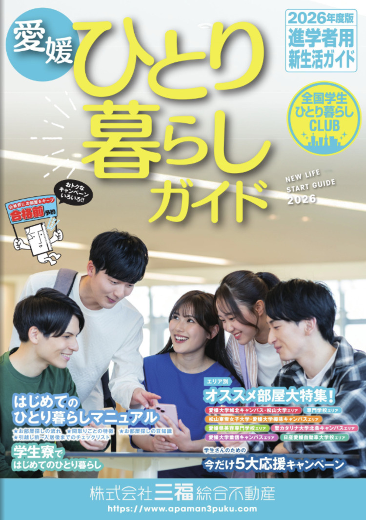 三福綜合不動産では、進学を機に松山で一人暮らしを始める学生の皆様に向けて、「愛媛ひとり暮らしガイド2026」 を発行しました。
