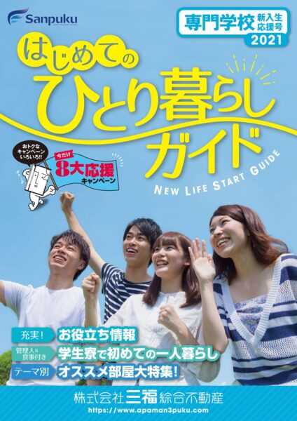 三福のアパマンショップ各店では、この春専門学校へ入学される皆様へ「はじめてのひとり暮らしガイド」をお渡ししております。