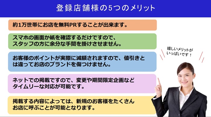 ポイントシステムですので、値引きという印象を与えずに、あなたのお店情報を発信することができます。