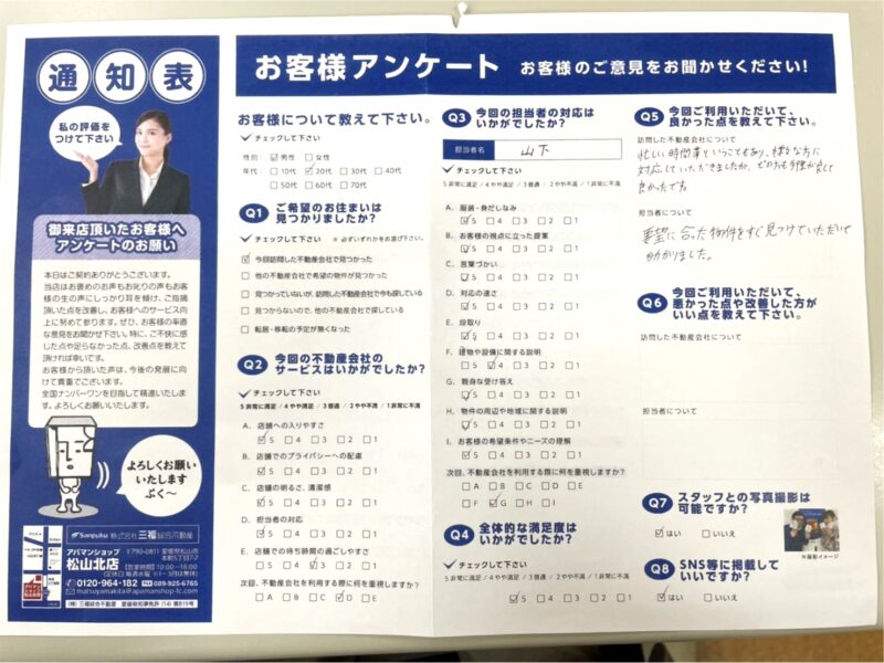 今回はアパマンショップ松山北店のお客様からいただきましたアンケートをご紹介いたします!
