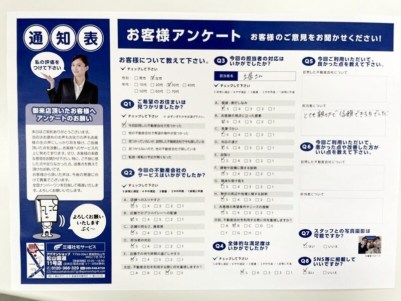 三福綜合不動産・松山賃貸ナビでは、お客様からのアンケートをご紹介しております。