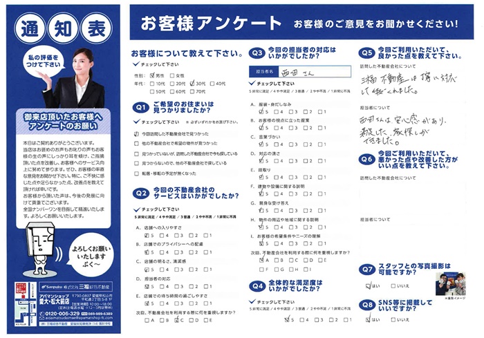 三福綜合不動産のアパマンショップ愛大・松大前店店長が、ご契約いただいたお客様からのアンケートで好評価をいただきました!